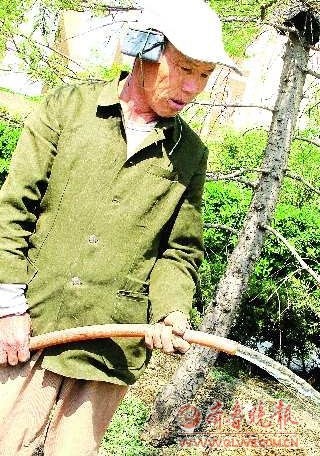 自述:小区的绿化工人在花坛浇水时,把收音机固定在耳边。