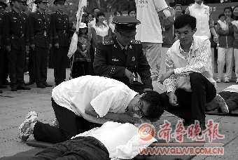练,演练包括创伤应急处理、心肺复苏、灾难逃生等。图为一名红十字志愿者