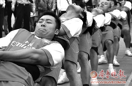 5月7日上午,2011年全民健身活动月启动暨济宁市首届全民健身运动会开幕式,在全民健身广场举行。据了解,山东省首届全民健身运动会自5月至10月举办,运动会共设拔河、地掷球、攀岩、象棋、围棋等26个比赛项目。本次全民健身活动月的主题是“全民健身、共迎省运”。图为开幕式后,济宁市体育局举行了拔河比赛。