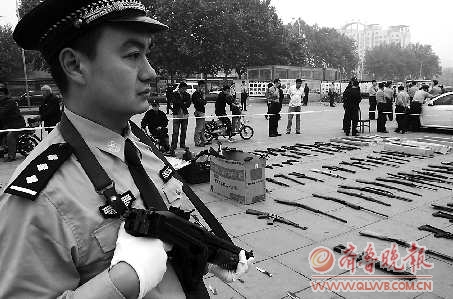 活动现场,收缴的各类枪支、刀具整齐地排放在展区,防暴警察在展区警戒,很多市民驻足观看。在假烟展示区域,工作人员耐心地向市民讲解真假香烟的辨别方法,让市民提高防骗能力。活动现场,两位车主领回了自己被盗抢的车辆,并分别为办案民警献上锦旗,表达谢意。