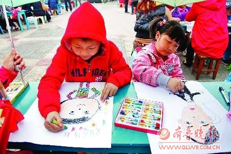 型亲情活动,在日照海纳少年宫门前广场举行。孩子们用画笔仔细地画着自己
