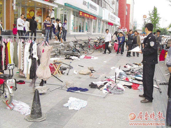 张女士报了警,随后丈夫打电话叫来了几个朋友,将衣服摊全部推倒在地,并将衣服架拆得七零八散。女摊主也拨打了报警电话。