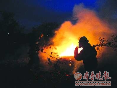 6日晚上7时许,德兴北大道与萱蕙路交叉路口附近的一片杂草地突发火灾。消防官兵接警后迅速到达现场,用水枪、树枝将大火扑灭。 本报记者 徐乐静 摄