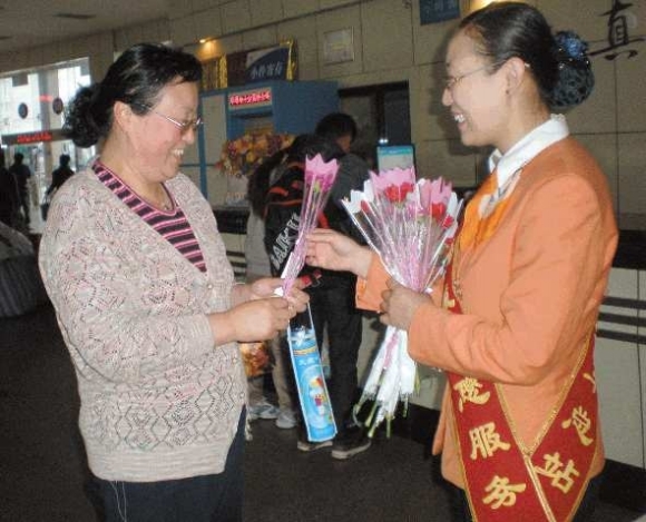 母亲节当天,聊城汽车总站为一些女性乘客送上鲜花,送去节日的祝福。