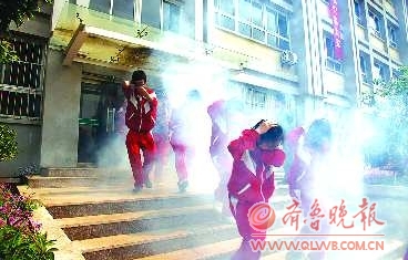 5月12日,日照港中学的校园里响起了一阵尖锐的地震警报声,“开始撤离”,随着老师一声令下,学生们纷纷抱头有秩序地撤离教室,并在撤离的同时用衣服手绢捂住口鼻,弯腰前进,防止中毒。
