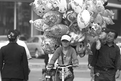 时间:5月6日 事件:在市区街头,一位女子将数只卡通氢气球拴在自行车后座上,仿佛是一辆“球球车”,吸引了来往路人的目光。 摄影 鲁杰 (奖金 50元)