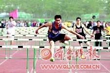 12日,烟台大学2011年田径运动会在校体育场拉开帷幕。图为学生110米跨栏比赛,一名运动员遥遥领先。