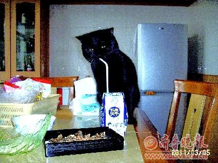 作品描述:主人刚放下一盒奶起身离开餐桌,这只猫就