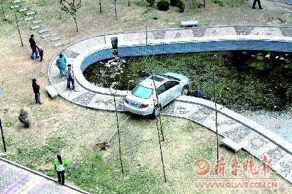 拍摄时间:4月28日拍摄地点:烟台新世界花园作品描述:在小区楼上偶然看见一辆轿车半身悬在水池边上,是不是因为天旱,车也想喝水了?相机型号:佳能500D作者:田强奖金:50元