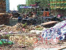 下午3点左右,记者来到“田园牧歌”房地产施工现场,记者看到大风吹过,工地上尘土飞扬,到处堆放着木板、竹板、层板等建筑材料。一位负责施工安全的工人告诉记者,由于风太大,施工比较危险,干活的工人比平时少,但是为了赶进度,还是有不少工人冒着危险在干活。