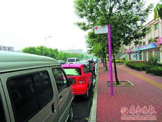 5月12日,在黄十渤八路口33路公交站牌前停满了小汽车,致使33路公交车无法在站牌前停靠。 本报见习记者 于荣花 摄