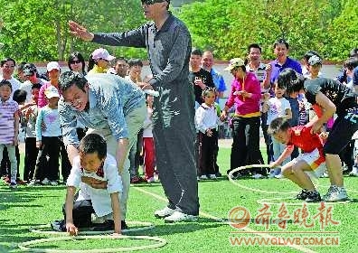 5月14日,山师附中的操场上,山师附小的小学生和家长共同参加“蚂蚁搬家”的比赛。当日,该校举行了趣味运动会,并邀请一年级的家长共同参加,让刚入学的孩子及家长共同认识到体育锻炼的重要性。本报记者 郭建政 摄