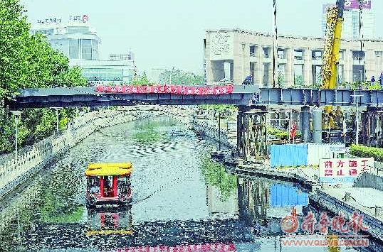 15日凌晨2时38分,重达40吨的第一段主梁被吊车缓缓提起,在吊装指挥人员的指挥下,用了不到1小时的时间,跨越护城河的第一段主梁吊装已经就位。随后第二段主梁也顺利就位。这意味着恒隆广场过街天桥完成跨河主梁的吊装工作。