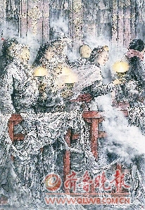 苗再新绘画中的“文化性”可说是他艺术创作中极耐品评的另一韵味,这是他多年来对传统文化与绘画艺术的理解与消融后的结果,也是当代画家所忽视和缺少的。犹记学者辜鸿铭先生说的:“中国文化有四个特点:单纯、深沉、灵敏、博大。”延伸到绘画创作中,可见在当代画坛不是技巧的匮乏,而是艺术上文化与精神的丧失。因而缺乏文化内涵和传统笔墨的艺术创作,表现手法再丰富多彩也只流于单薄浅显而失于厚重,即使在笔墨上如何淋漓尽致地发挥也终将因为少些意境文心而显得“荒率”而游离于自然之外,走向媚俗与欺世!从古到今,任何艺术大家无不是学养深厚的学者,因为“学养的高低必然从作品中表现出来,显示出画的品格”。在苗再新作品中可看出深厚的文化底蕴下弥散着扑面而来的生活气息,充满意境与哲思的笔墨语言使他在扩大题材的表现上重新在文化意义上走向完美,从深厚走向宽广。