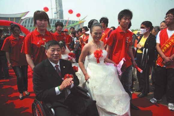 在人民广场婚礼现场,记者见到了这18对新人:他们中有运动健将丁二伟,曾经多次在国家、省级、市级残运会上夺金;有技术能手贾树明,虽然双目失明,但是通过研究按摩技术而成为了“专家”。