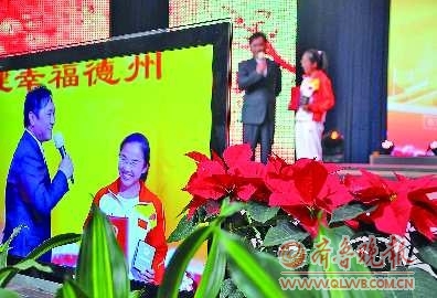 “来自禹城的王玉芹,是一名视力二级残疾的女孩,在去年的广州亚残运会上两度摘金。”当活动主持人如此介绍观众眼前那名看上去比较瘦弱的女孩时,现场报以热烈的掌声。今年3月份,王玉芹被授予“山东省劳动模范”荣誉称号。图为王玉芹现场接受了主持人的采访。
