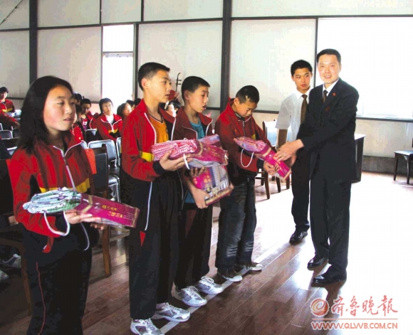 在第21个全国助残日到来之际,5月13日下午,东方假日酒店酒店副总经理孙永军带领工作人员来到泰安市盲校,为盲校学生带去了2000多元善款、150条优质床单和数箱盲文纸。图为盲生们领到了崭新的床单。本报见习记者 王鸿哲 摄