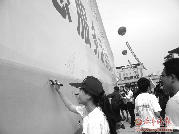 者还在泰山广场、天外村广场和嘉德社区分别开展了环保、慈善、救援培训等活动。图为志愿者正在背景墙上写
