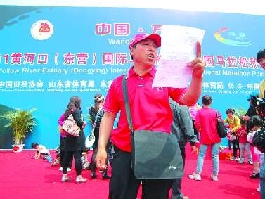 黄河口马拉松赛女子组颁奖仪式结束后,有一名男子跑上台唱起了他自编的一首歌《千古美名黄河口》,引起了在场观众的阵阵掌声。他叫王要轩,为黄河口马拉松赛自编了两首诗一首歌。