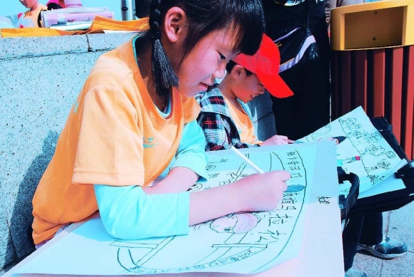 在新世纪广场,孩子们在描绘自己心目中的马拉松比赛。本报记者 郑美芹 摄