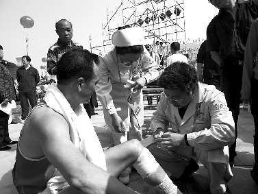 上午9时许,一名男子半程参赛选手走到比赛路线终点的急救站,说脚有些疼,医生赶紧让他坐到垫子上查看,发现他的脚底已经起泡,给他贴了两个创可贴,叮嘱他走路小心不要压破水泡。这是急救站帮助的第一个受伤选手,接下来医护人员越来越忙,选手的伤情也不像第一个那么轻微,擦伤、晕厥、神志不清……有的现场救治后便无大碍,情况严重的则被送往医院急救。