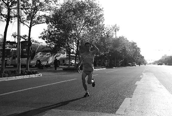 “中国万达”2011黄河口(东营)国际马拉松赛于5月15日在东营举行,5月14日下午5时许,记者在东城府前大街上看到已经有多名选手奔跑在赛道上。记者对其中一位来自福建霞浦的选手林庆生进行了采访,他信心十足地告诉记者,自己已经跑过了4次马拉松半程赛,这一次他和朋友相约,决定挑战一下自己,跑全程马拉松赛。