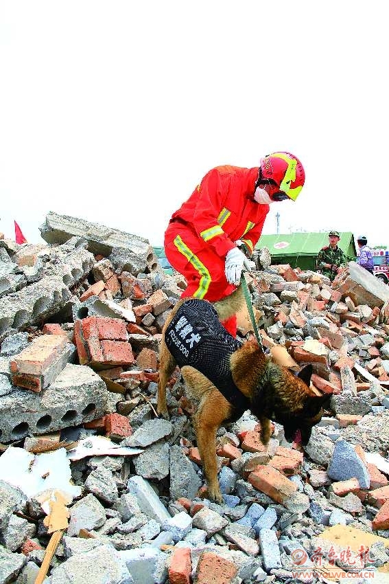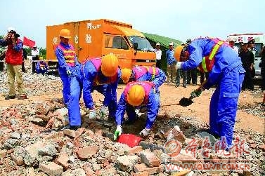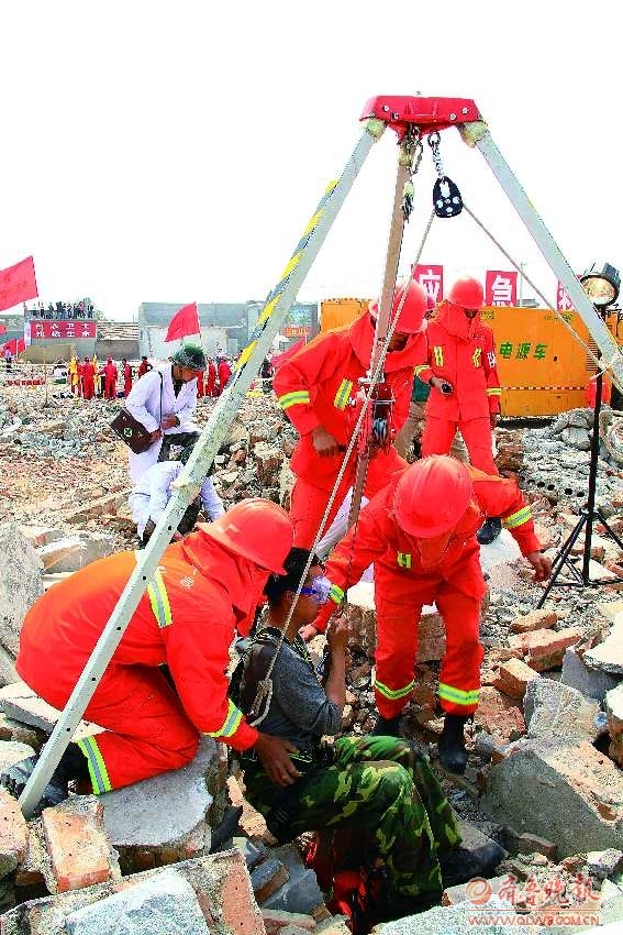 在演练场地4号区域内,省地震灾害紧急救援队携带搜救犬、搜救设备等在地震废墟上进行救援,开展了混凝土破拆、狭小空间顶升救援、竖井救援、巷道救援等不同情况下的营救。救援人员在余震不断的废墟中救出了最后一条生命。