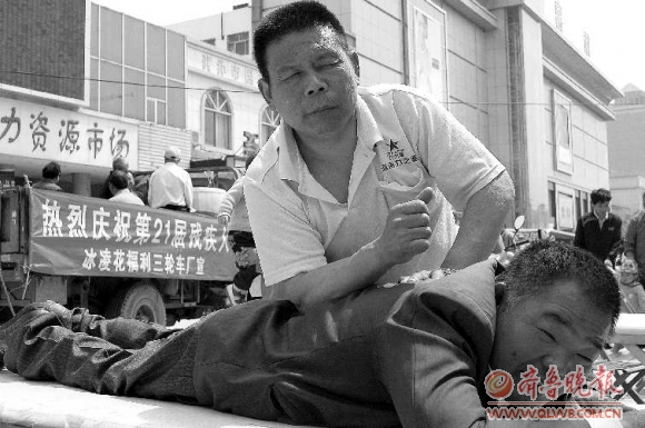 15日一大早,在菏泽市人力资源市场外的广场上,聚集了大约400多名市民。他们,都是来自菏泽市各个县市区的残疾人士。虽然身体不便,但这些人有的带着擦鞋箱,有的拉来按摩床,还有的开着摩托车,就地铺开摊子忙活了起来。而这些服务,都是免费的。