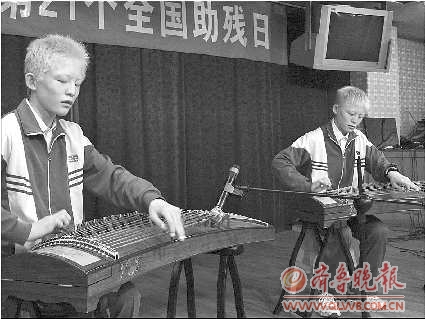 15日是第二十一个全国助残日,在滨州市特殊学校的庆祝会上,演奏古筝二重奏的一对双胞胎兄弟格外引人注目。他们闭着眼睛,似乎在用心感受着琴弦上跳跃的音符,他们就是该校盲七年级的学生杜逍、杜遥。