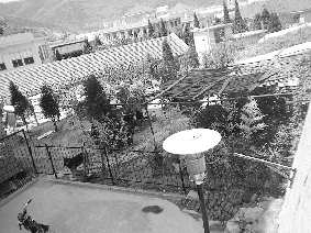 16日中午,登上魁星楼苑附近的小土山,可以清晰地见到小区东北角的这处小花园。花园的东侧是两个花棚,棚边种着几棵爬山虎,青翠的枝条在小区围墙上伸展。几株修竹已经枯黄,但花园里其他树木则长势旺盛。花园的正中是一个鱼塘,四周摆满了盆景。花园还没完全成型,只有一条方砖铺就的小路,边角处还能看到许多石块以及枯死的矮树。