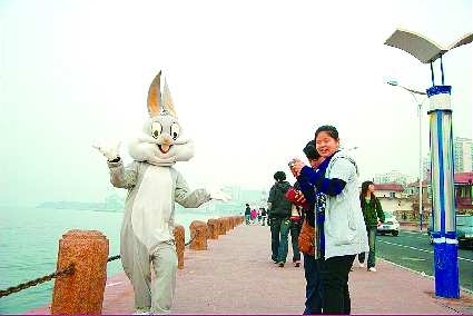 作品描述:在烟台山海边,一名女大学生利用假期扮演成“兔子”和游客拍照。虽然每次收费10元,但由于造型非常可爱,游人纷纷与之合影。