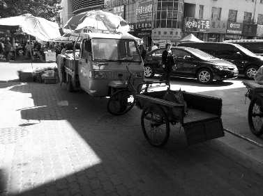 5月16日,记者在胶州路众成商场附近看到,在人行道的盲道上密密麻麻地停满了自行车,一些商贩也将摊位直接摆在了盲道上。盲道本是为盲人提供行路方便和安全的,现在却成了商贩的摊位。
