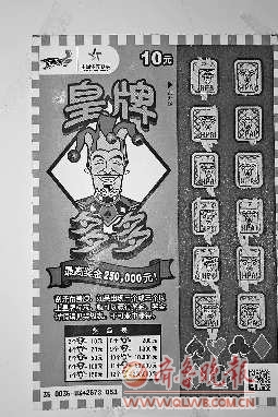 这天,老王刮了几张彩票后,特意把站内剩下的面值10元的“皇牌多多”都要了下来,因为这种玩法很有特点,是按照彩票上刮出的皇牌数量多少计奖。在其中一张“皇牌多多”上,老王一出手就在刮开区内刮出了4张皇牌,他以为自己赢得了20元奖金。可是,当刮开覆盖膜后,让他惊讶不已的是,竟然连续出现了12个皇牌标志!熟知游戏规则的老王意识到自己中出了25万元的大奖,于是便揣起彩票,欢天喜地地回家报喜去了。