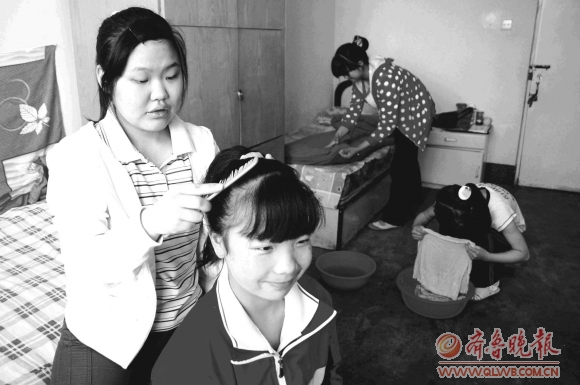 16日,泰安盲人学校举办以“帮你做件事”为主题的残疾人互助活动,提倡残疾人之间要互相关心、互相帮助。图为七年级的贠俊豪(左一)在宿舍为同学吴倩倩梳理头发。