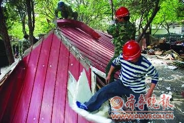 16日,市南区多部门联合对八大关区域内七处违法建筑进行了强制拆除,拆掉的总面积达200平方米。据了解,这是自12日下发拆除公告后的首次强拆。图为工人依法拆除嘉峪关路9号的一处板房。本报记者 张晓鹏 摄影报道