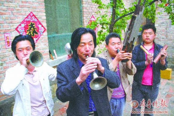 陈家唢呐班即将代表山东省进京参加建党90周年文艺演出了。有着三百多年传承的家族技艺被这一代传承人陈建斌、陈建坤由街头“吹”进大雅之堂,被誉为民间艺术。处于乡野之间的陈家班为何有这样的殊荣?日前,本报记者前往巨野县万丰镇采访。本报记者 徐升 摄