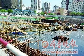 为了能看到现场,记者从另外一个门口偷偷进入了工地,看到长约30米的铁质塔吊从南向北倾倒在一处脚手架上,还有一段砸在工地围墙外面的马路上,几名工人正在清理塔吊砸碎的垃圾。在记者拍照之后,施工方发现了记者,将记者赶出了工地。