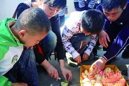 轮到孩子们自己切胡萝卜和苹果时,不少孩子拿着小刀有些紧张。胡萝卜有些硬,孩子切了半天切不开。苹果较大,切起来也不轻松。给猴子喂食时,为了不让猴子们过于激烈拼抢,孩子们使劲儿往远处扔食物。看着猴子为了抢食而打得你死我活,孩子们有些吃惊。“即使是母子,它们也不顾情面去抢食。母猴平时很照顾自己的孩子,但是到了吃饭时,绝不会让着孩子,这是母猴在培养孩子独立的生活习惯。”饲养员讲解道。