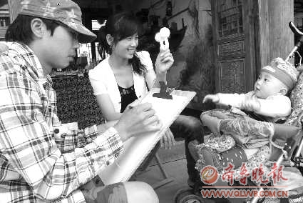 5月12日,在台儿庄古城船形街上,一位青年画家以古城美景为背景正在给一孩子画素描画像。船形街,为全国非物质文化遗产展销街区,这里集中了全国各地的地方名优特产和手工艺品,如东阳木雕、潍坊风筝、泸州油纸伞、山东面塑等全国非物质文化遗产在此集中展现。