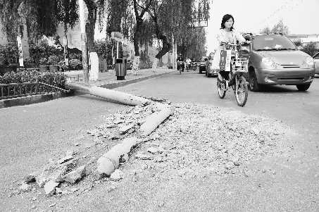 “电线杆倒下时,前面有个人骑着电动车,后面跟着一辆宝马车,电线杆正好倒在两者中间,很幸运两者都没有伤到。那个骑电动车的女士吓得呆了半天,足有一分多钟才缓过来。”一名附近的住户告诉记者。