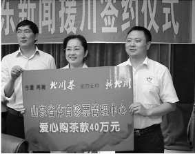 5月12日,“情注北川茶”洽谈会暨山东新闻援川签约仪式在北川举行。山东省体彩中心等爱心单位代表以及北川县8家茶叶企业参加了签约仪式。山东省体彩中心现场采购了40万元的北川茶,以实际行动表达山东体彩人对支持北川灾后建设的一份关心。