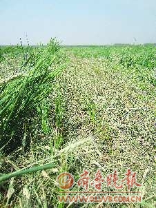 17日上午,记者顺着村民的指引来到这片被毁坏的麦地。大片小麦或倒伏在地上,或被从根部截断,大堆已经干黄的麦穗掉落在地上,现场一片狼藉,让每个看到此情此景的人都感到惋惜和痛心。