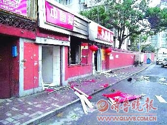 记者看到,爆炸发生在临街的“张英醉仙鸭”店。这家店的两扇营业铁窗已被爆炸气流冲开,外墙顶被烟熏黑。里面墙上则黑一块白一块,地下一片狼藉。爆炸中的一些碎玻璃,深深嵌入烤鸭店对面三四米外的一座工地板房的墙上,板房几间屋子的窗玻璃被震碎。