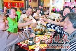 18日中午,岔路街社区的贫困居民、下岗职工、五保家庭,擦鞋工、菜贩、环卫工等在一起聚餐。2007年5月18日,下岗女工张娟在济南开了这家渝新干锅辣鸭头总店,从此走上了创业之路。 本报记者 董从哲 摄