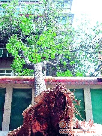 本报5月18日讯(记者 吴金彪 实习生 高晴雯)17日晚,一阵大风过后,经四路西头某居民楼一棵有20多年树龄的梧桐树突然连根拔起,砸向附近居民楼,粗大的树枝穿过窗户,“闯进”了居民家中。