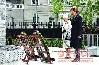 5月17日,正在爱尔兰进行国事访问的英国女王伊丽莎白二世(左一)在爱尔兰总统玛丽·麦卡利斯的陪同下,在都柏林的国家战争纪念花园出席纪念活动时敬献花圈。伊丽莎白二世当天起对爱尔兰进行为期4天的国事访问,这是英国君主一百年来首次访问爱尔兰。 新华社/麦克斯韦图片社