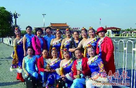 今年4月,中国老年学会老年文化委员会给威海市艺术中心发来一封邀请函,邀请参加“七彩夕阳”欢聚人民大会堂第二届全国中老年优秀文艺节目汇演活动,经过一番深思熟虑,艺术中心的工作人员找到了宋淑娟。外出演出的费用比较高,但想到能到人民大会堂表演,团员们都非常兴奋。当时时间比较紧,宋淑娟垫付了5000元交到组委会,经过紧张的筹备,5月8日,舞蹈团踏上了进京演出的路。她们表演的舞蹈《扎西德勒》、时装表演《中华美德》双双夺得金奖。站在人民大会堂的领奖台上,威海的俏老太们笑得格外灿烂。