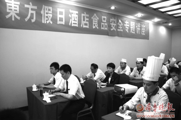 18日下午,为切实保证就餐顾客的身体安全,东方假日酒店邀请泰安市食品化妆品监督所工作人员对酒店各岗位人员进行了食品安全专题讲座。图为参会人员在认真听讲。