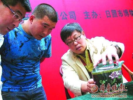 5月18日是国际博物馆日,来自故宫博物院的三位鉴定专家来到日照博物馆,为市民鉴宝。百余位收藏爱好者携带着107件“宝贝”赶到现场鉴宝。据博物馆统计,所鉴宝贝七成为赝品。图为专家正仔细鉴定市民的宝贝。 本报记者 姜海姣 摄