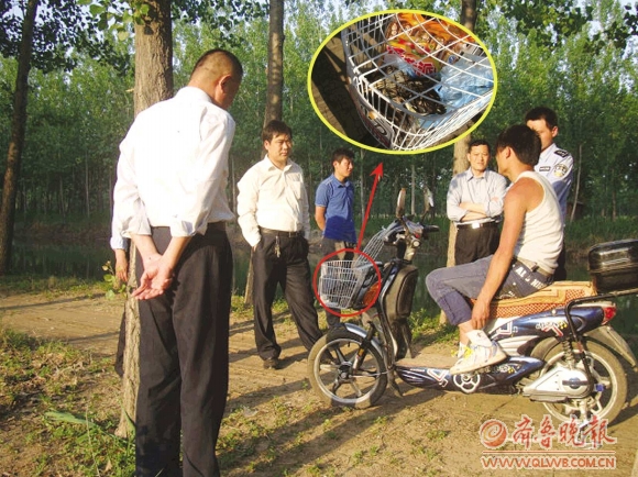 许登峰回忆,两名男青年大约40分钟后才从树林里出来。走出树林时,一名蓝衣青年手里提着一个鼓鼓的红色塑料袋,另一人手里拿着一支仿真玩具枪。他们把塑料袋放入电动车筐,推着电动车向南走,这时,许登峰与何树龙迎头向两名青年走去。